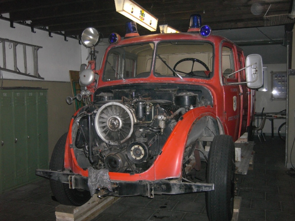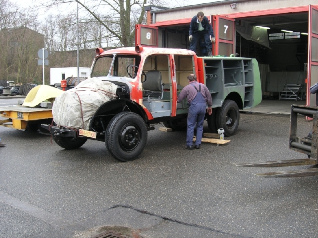 In unzähligen Arbeitsstunden wurden alle Teile entrostet, repariert, lackiert und wieder montiert. Das Gerätehaus Habbelrath diente über ein Jahr als Werkstatt und - fast noch wichtiger - als Treffpunkt der Oldtimer-Freunde des Löschzuges. LKW-Schlosser, Autolackierer, Elektriker, Schreiner und viele weitere Fachleute taten ihr Bestes, um das Fahrzeug wieder annähernd in den "Neuzustand" zu versetzen. Und in der Tat, nach der Restaurierung war das Fahrzeug wieder voll funktionstüchtig, also "einsatzbereit".